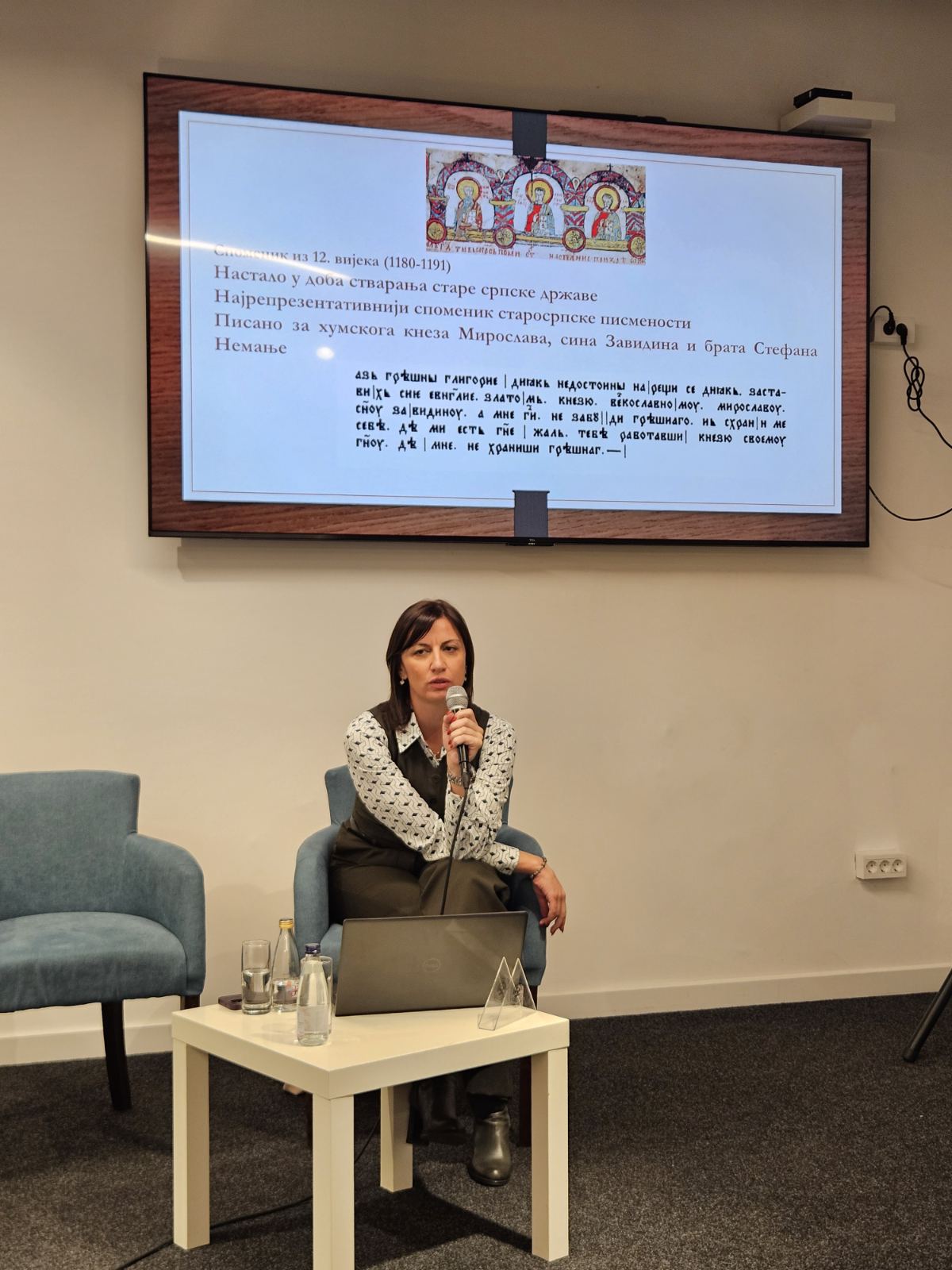 У наставку програма манифестације Дана Матице српске – Друштва чланова у Црној Гори, 1. новембра, у Никшићу у Матици српској, предавање о Мирослављевом јеванђељу одржала је доц. др Јелена Газдић, руководилац Студијског програма за српски језик и јужнословенске књижевности на Филолошком факултету у Никшићу. Газдић је подсјетила публику на историјат овог драгоцјеног српског средњовјековног споменика, који се налази под заштитом Унеска од 2005. године. Рукописна књига раскошне љепоте настала је у посљедњој деценији 12. вијека, по наруџбини хумског кнеза Мирослава, стрица Св. Саве, рођеног брата Стефана Немање, а писана је за потребе богослужења у Мирослављевој задужбини, цркви Светог Петра у данашњем Бијелом Пољу. Доц. др Јелена Газдић говорила је о језичким особеностима овог рукописа, осврнувши се посебно на рукопис и ортогорафију писарā, која свједочи о српској редакцији старословенског језика. Указала је и на разлике између дјелова јеванђеља које је писао главни писар (доминантно се држећи глагољском правописног насљеђа) и дјелова чији је аутор дијак Григорије (доминатно рашким правописом).