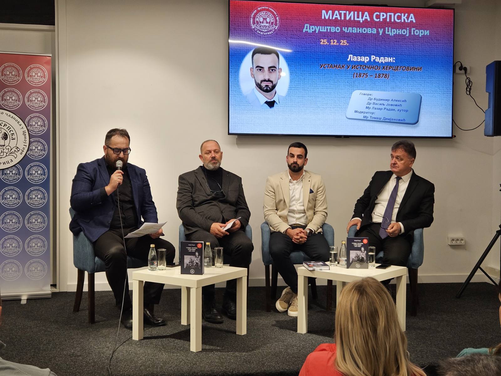 Јуче је у културном центру Матице српске – Друштва чланова у Црној Гори у Никшићу представљена књига мр Лазара Радана, „Устанак у источној Херцеговини 1875-1878“ о којој су говорили др Будумир Алексић, др Васиљ Јововић и аутор. Промотивно вече је водио мр Томаш Дамјановић, секретар Одјељења за историју, који је у свом уводу истакао да Раданова монографија тематизује „једно од кључних, али недовољно обрађених поглавља наше националне историје“, те да његов „приступ омогућава да се устанак сагледа цјеловито, али кроз једну регију, као својеврсну лабораторију историјских процеса тог времена“.